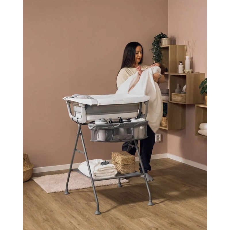 Para que puedas tener todo lo que necesites para el baño (toallas, productos de higiene, juguetes de baño) cuenta con compartimentos. Un compartimento lateral a la misma altura de la bañera y un compartimento inferior a modo de bandeja que te facilitan la hora del baño sin perder de vista a tu bebé en ningún momento.