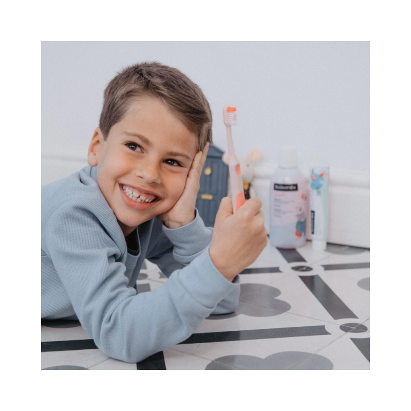 Contiene flúor para prevenir la caries y fortalecer el esmalte, con un suave sabor a fresa que hace del enjuague un momento agradable.