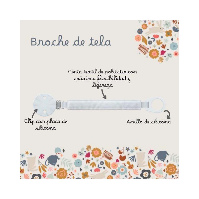 Este precioso sujeta chupetes de Suavinex tiene un sistema de sujeción de pinza con embellecedor con forma de broche redondo con la carita de un gato dibujada. Es un chupetero de cinta de tela decorada con dibujos en ambos lados, es ideal para aquellos papás que no les guste que el bebé chupe la cadena plástica habitual en los sujeta chupetes. Se adapta a todos los chupetes del mercado siempre y cuando cuenten con asa para colocarle la anilla de sujeción. Es un complemento estético para tu bebé pero es muy útil fuera de casa, el chupete nunca caerá al suelo ya que queda colgando cuando el bebé no lo está chupando y evitas tener que lavar su chupete cada vez que toca el suelo.