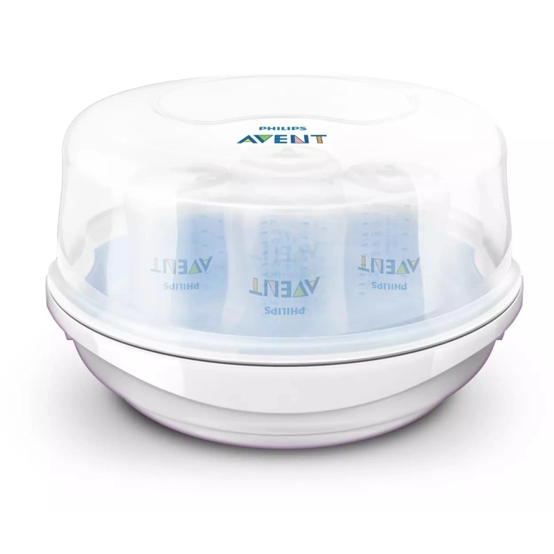 En los primeros meses de vida de tu bebé su sistema inmunológico es frágil y muchos gérmenes del día a día podrían provocarle alguna complicación como diarrea o dolor de barriga. Además la leche de fórmula y materna pueden generar gran cantidad de bacterias en los biberones si la limpieza no es muy profunda y minuciosa. Para evitar todos estos problemas, los pediatras recomiendan esterilizar los biberones, tetinas y chupetes de tu bebé durante los primeros meses y evitar este tipo de inconvenientes. El esterilizador Avent para microondas es el método más rápido y sencillo para mantener los biberones, tetinas y chupetes de tu bebé libres de gérmenes durante sus primeros meses de vida. Su sistema de esterilización es al vapor, sólo tienes que poner un poco de agua y colocar los biberones y/o chupetes en su interior y ponerle la tapa. Lo introduces en el microondas y en tan sólo 2 minutos, dependiendo de la potencia de tu microondas, se eliminarán el 99,9% de los gérmenes presentes en los biberones de tu bebé. Además una vez esterilizado se mantiene en perfecto estado para se utilizados durante hasta 24 horas.