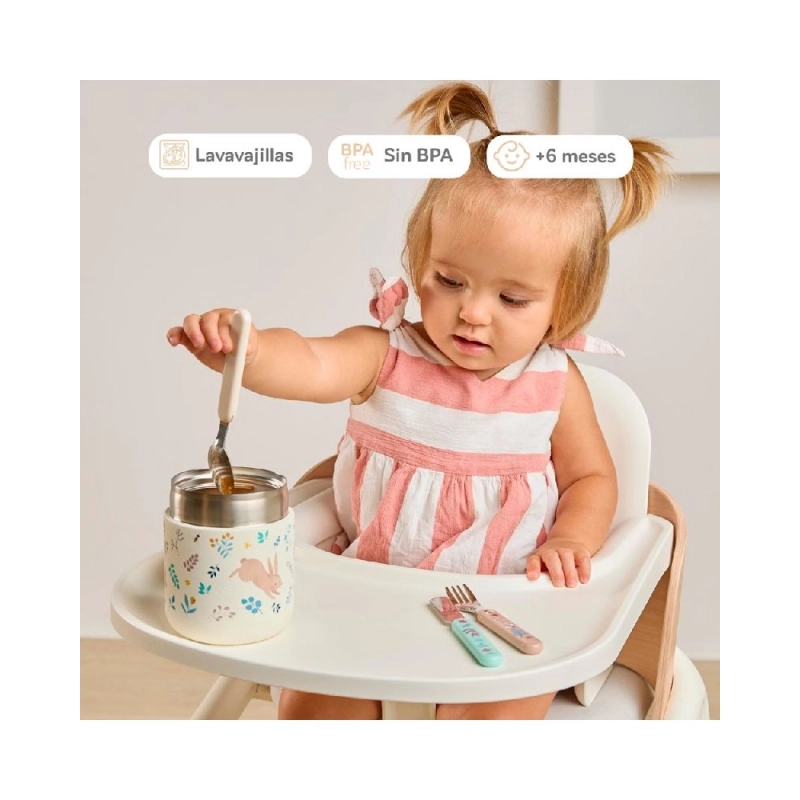 Su forma anatómica facilita el agarre, ayudando a que el peque pueda manipular los cubiertos con mayor seguridad.
