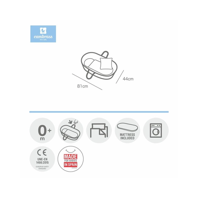 Este Capazo Palma Acolchado Une Liberty de Cambrass cuenta con asas para fácil transporte y certificaciones que garantizan calidad.