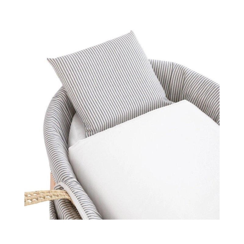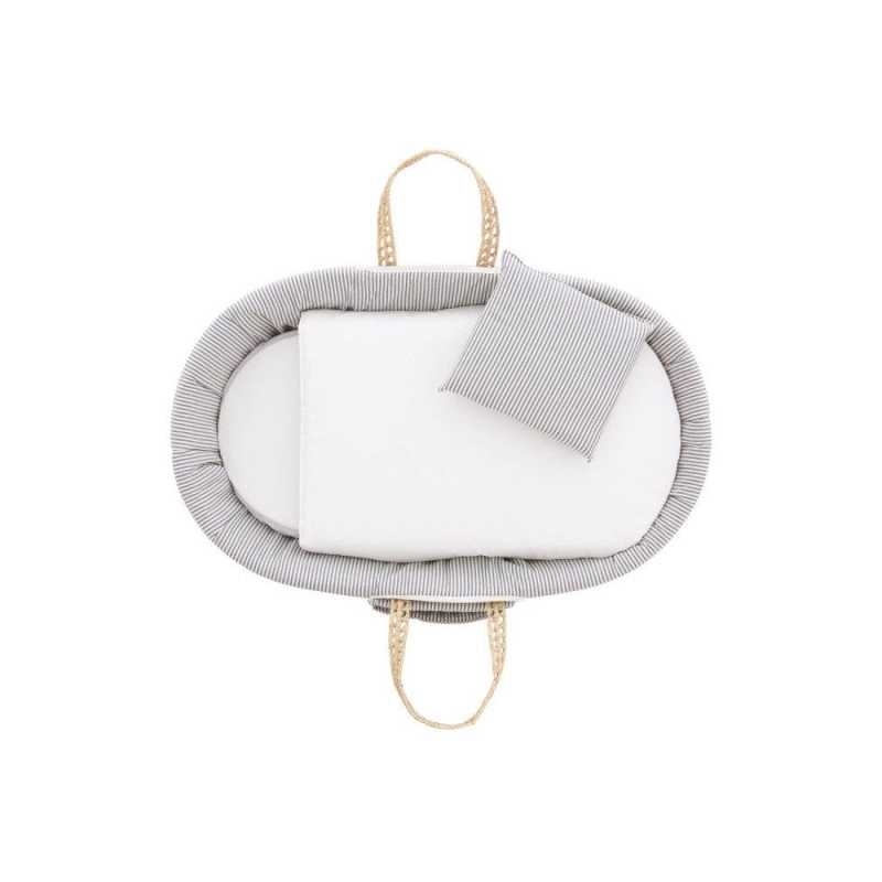 Su estructura rígida proporciona estabilidad y se complementa con un colchón, base tapizada y patas de madera barnizada natural que elevan el moisés a la altura ideal.