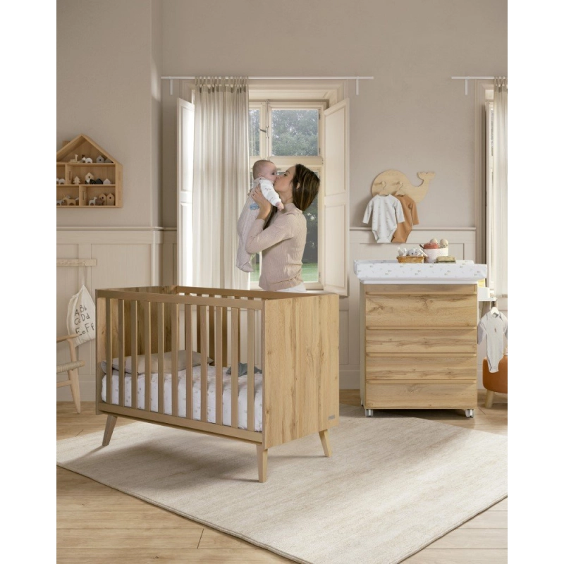 La Cuna Martha de Micuna cuenta con un estilo moderno y natural con su color roble. Una cuna de tamaño estándar 120x60 cm para los primeros años de tu bebé. Cuenta con 3 alturas de somier para adaptarse a las necesidades de tu bebé.
