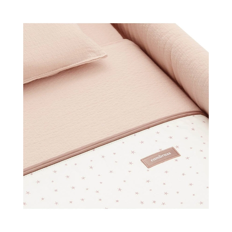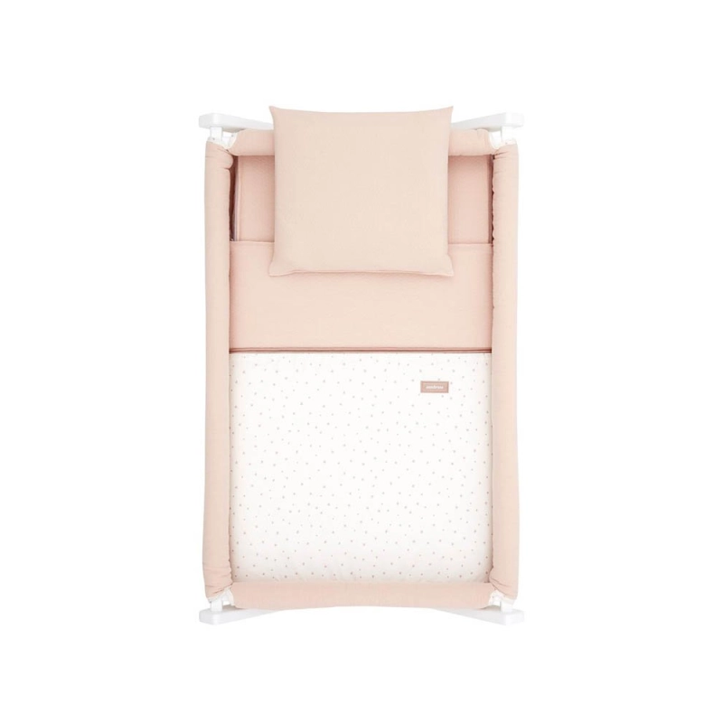 Esta minicuna incluye colchón, almohada, somier de madera y una vestidura cosida con colcha y relleno para mayor confort.
