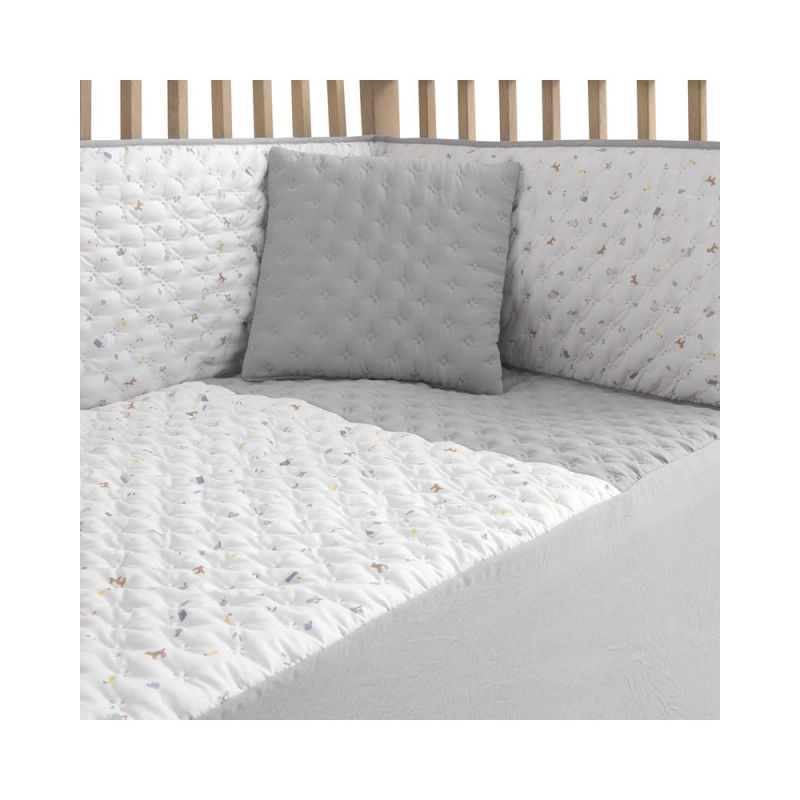 La colcha cumple la función de una manta o funda nórdica, protegiendo del frío en los meses más frescos. Gracias a su relleno extraíble, se convierte en una prenda versátil también apta para el verano, además de fácil de lavar. El protector, fabricado con tejido acolchado con fibra hueca en su interior, está pensado para amortiguar los posibles golpes del bebé contra los barrotes de la cuna.