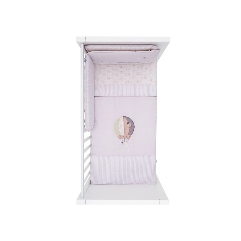La colcha actúa como protección frente al frío, de forma similar a una manta o funda nórdica, y cuenta con un relleno desenfundable que permite adaptarla fácilmente a distintas épocas del año. Esta característica facilita su uso tanto en invierno como en verano y simplifica el lavado y el mantenimiento diario. Además, incorpora tres volantes decorativos que ayudan a vestir la cuna con un acabado delicado y armonioso.
