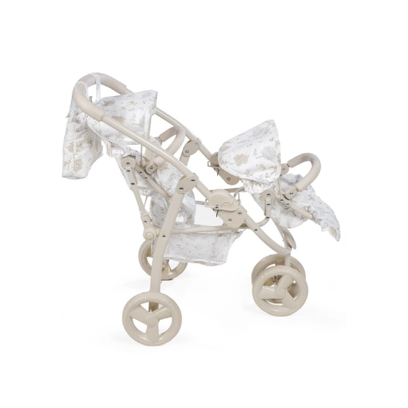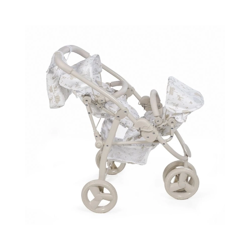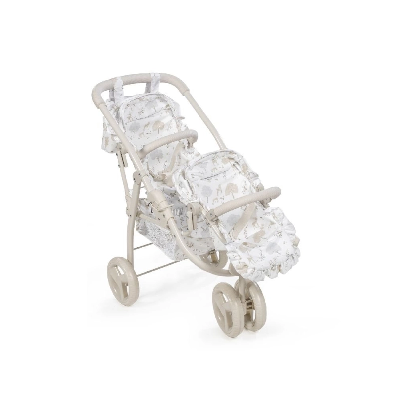Con dos asientos en tándem, este cochecito está diseñado para muñecas de 30 a 42 cm, ofreciendo la posibilidad de jugar en paralelo con dos “bebés” al mismo tiempo. Su manillar ergonómico se adapta a la estatura infantil, facilitando el control durante el paseo. Además, cuenta con una cesta de malla inferior para transportar accesorios y con un bolso de paseo a juego que complementa el conjunto con el mismo diseño Nara.