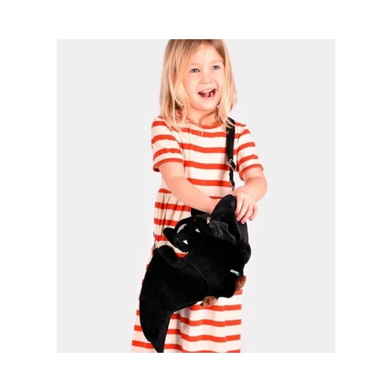 El Bolso Murciélago de Den Goda Fen incluye una correa larga, ajustable y extraíble en color negro, ideal para llevarlo cruzado o al hombro con total comodidad. Su textura suave y los detalles brillantes añaden un toque especial que hará las delicias de niños y niñas.