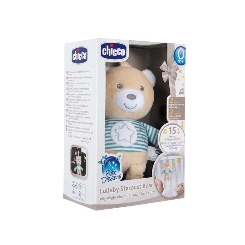 Mi primer Osito de Chicco es un peluche interactivo con luz y melodías diseñado para acompañar al bebé desde el nacimiento.