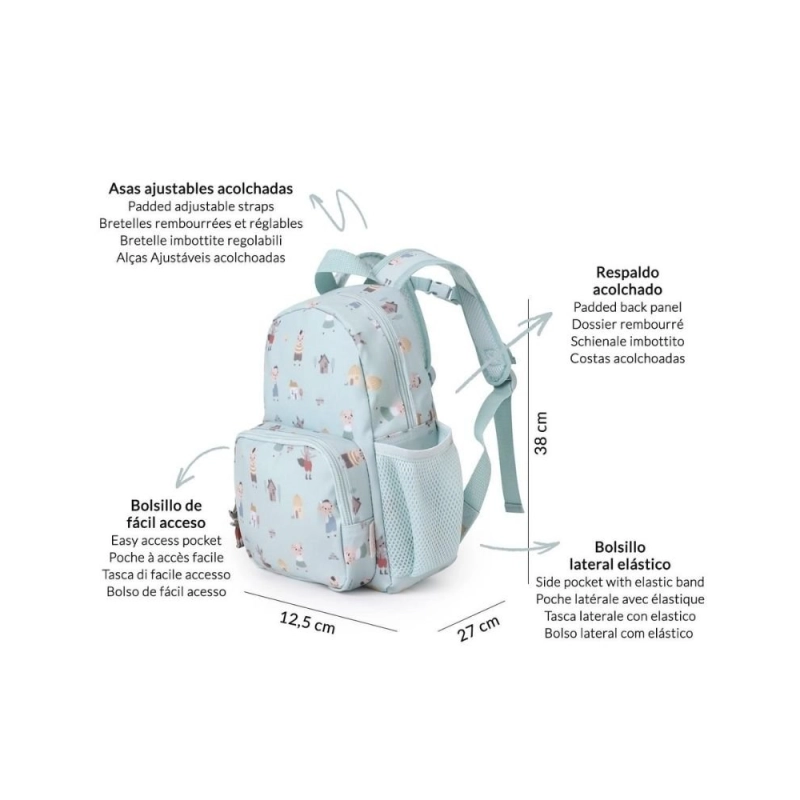 Está confeccionada con poliéster reciclado y sus medidas (28x25x9 cm) ofrecen espacio suficiente para llevar ropa, merienda o juguetes.
